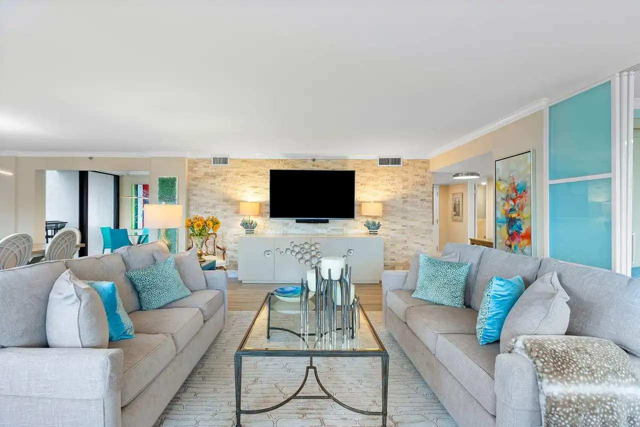 Wonderful waterfront property! This meticulously maintained, modern 3 BD / 2.5 BA unit offers breathtaking views through floor-to-ceiling panoramic windows, located in a fully renovated, fully compliant building overlooking the intracoastal and Lake Wyman (structural building restoration completed in 2022, milestone certification from the city of Boca Raton received in 2024). Negotiable custom furniture and mounted TVs enhance the allure, while the renovated kitchen features an induction stove, new refrigerator (Feb 2024), and a full-sized 100-bottle wine refrigerator. The primary suite is bedecked with decorated ceilings and a spacious walk-in closet. Two balconies and a living room with ocean views invite relaxation, complemented by a den/third bedroom featuring a Murphy bed and sliding doors.